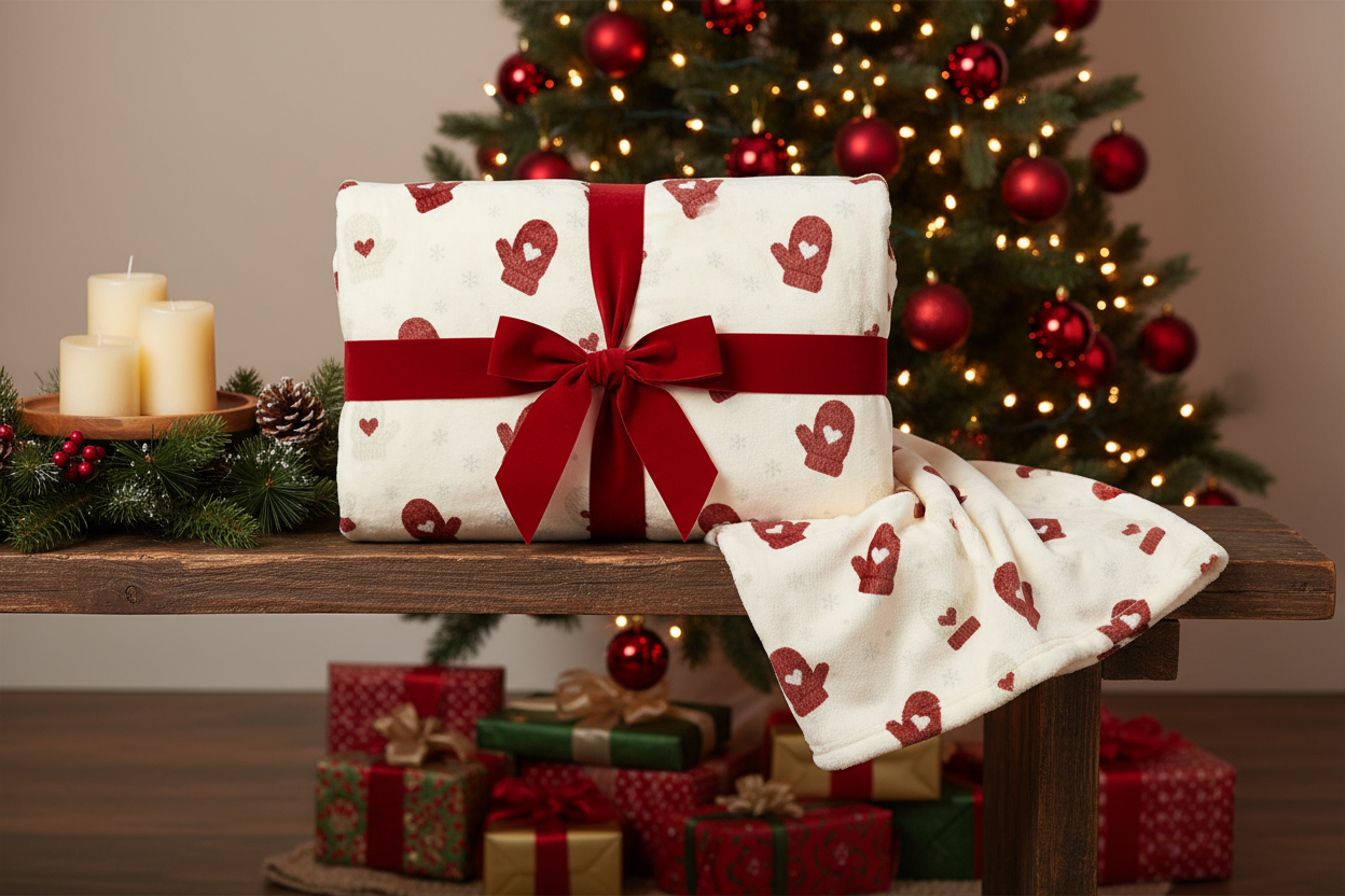 Cozy Mittens Blanket with a Christmas vibe, perfect for keeping warm during the holiday season. This blanket is made of 100% Polyester, featuring vibrant colors and a soft plush material. It is available in 3 sizes and has a flat folded edge for durability.
