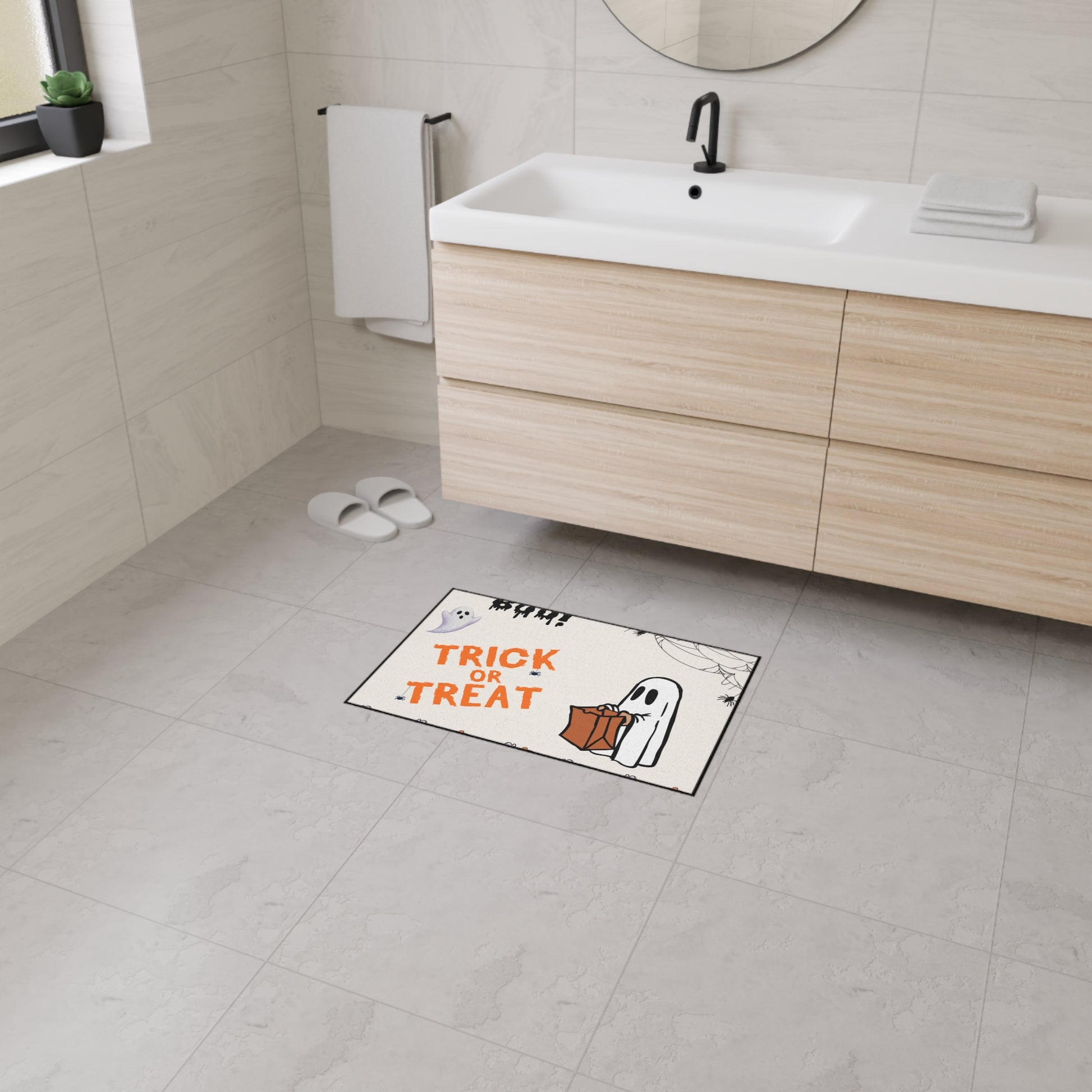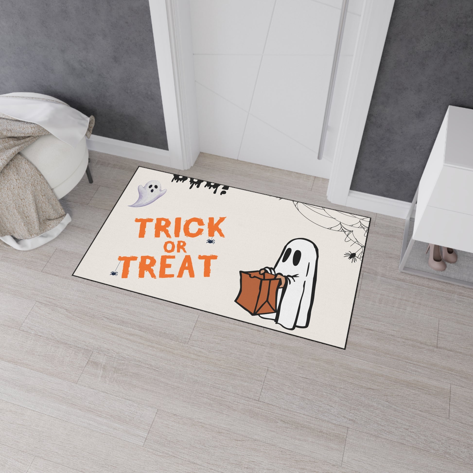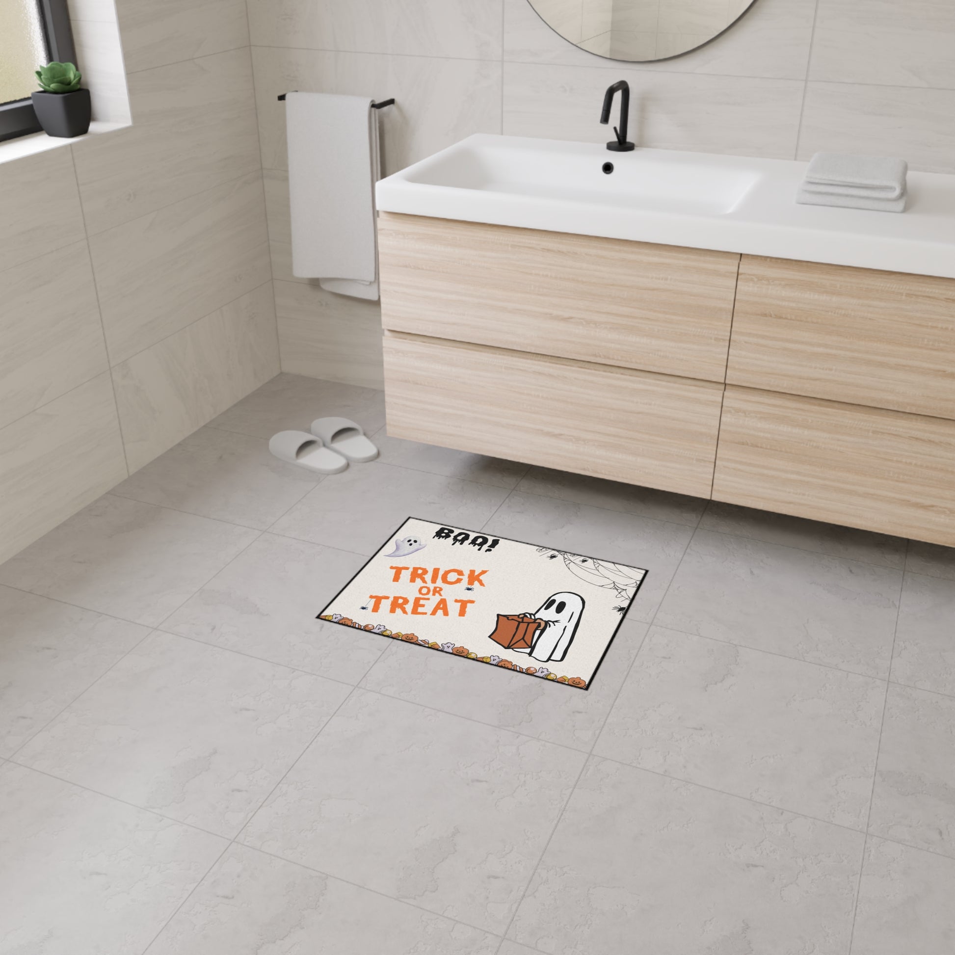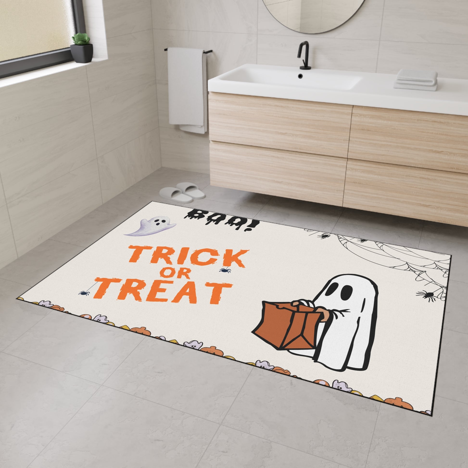 This Halloween-themed floor mat features a spooky ghost design with the words 'Boo Trick or Treat'. Perfect for adding a touch of fall home decoration and a festive vibe to your entrance. Ideal for those who love Halloween and want to greet their guests with a fun and seasonal welcome. Great for Halloween parties, trick or treat events, and home decor enthusiasts.