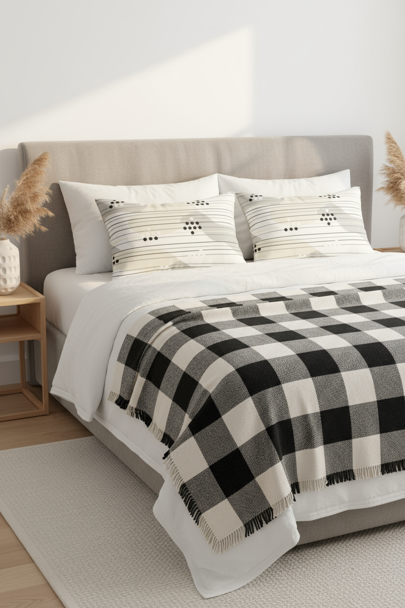 This perfectly coordinated set features a striking buffalo check throw blanket paired with two modern striped lumbar pillows that blend geometric patterns with minimalist design. The neutral palette ensures this bundle works seamlessly with any interior style, from Scandinavian minimalism to modern farmhouse.