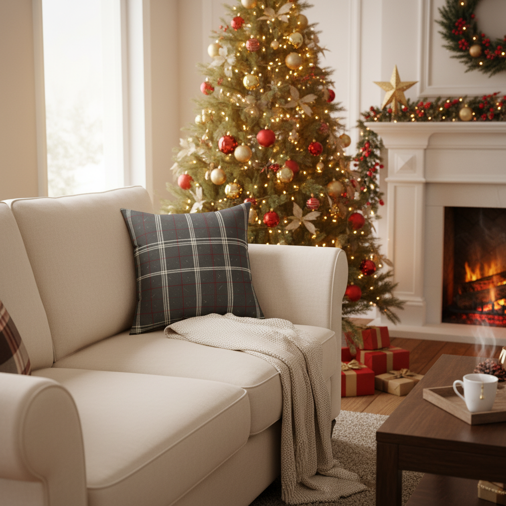 Gray Plaid Decorative Pillow - Cozy Plaid Throw Cushion for Living Room & Cabin Decor. This square pillow gives a cozy and rustic vibe, perfect for adding a touch of warmth to your living room or cabin decor. Ideal for those who love plaid patterns and enjoy a comfortable and inviting atmosphere. Relevant for holidays, cozy nights by the fireplace, and cabin getaways.