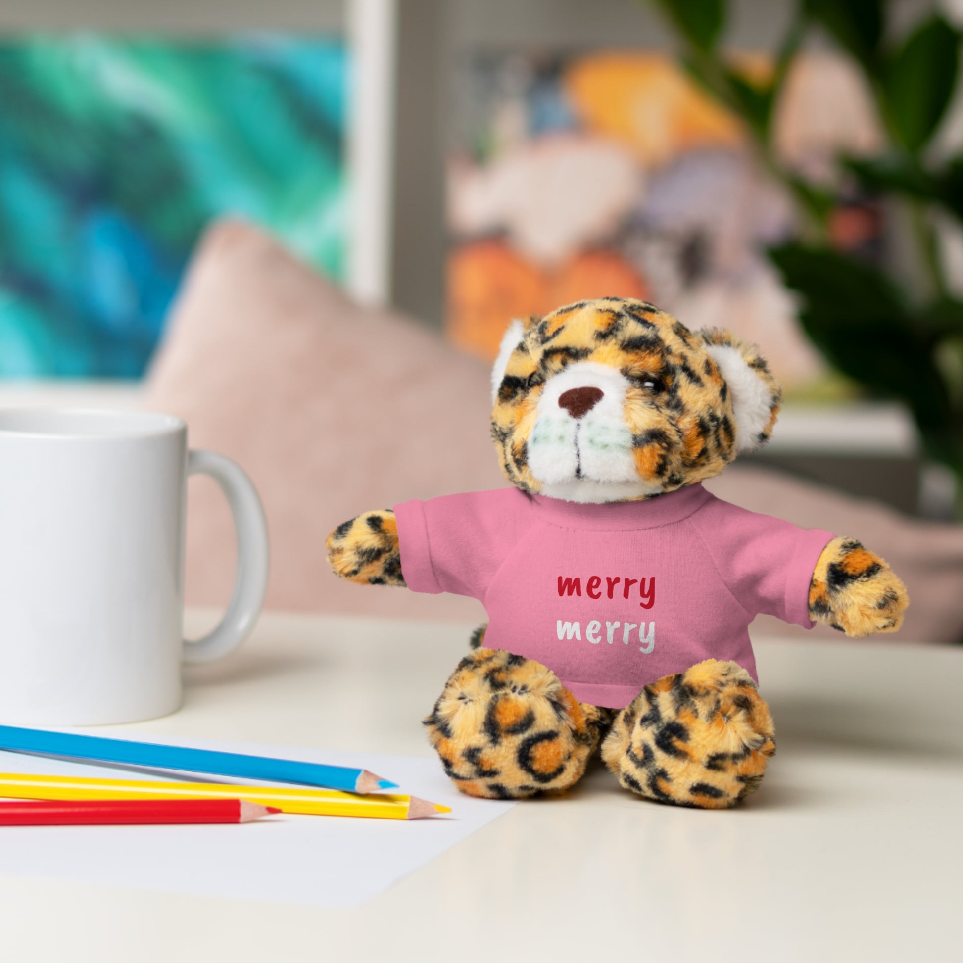 Soft and cuddly plush bunny wearing a 'Merry' tee, perfect for Easter celebrations. Ideal for children ages 3 and up, this adorable toy comes in 6 different animal options - Bear, Sheep, Bunny, Jaguar, Panda, and Lion. The customizable shirt color adds a personal touch to this 8" stuffed animal made of a cotton and polyester blend.