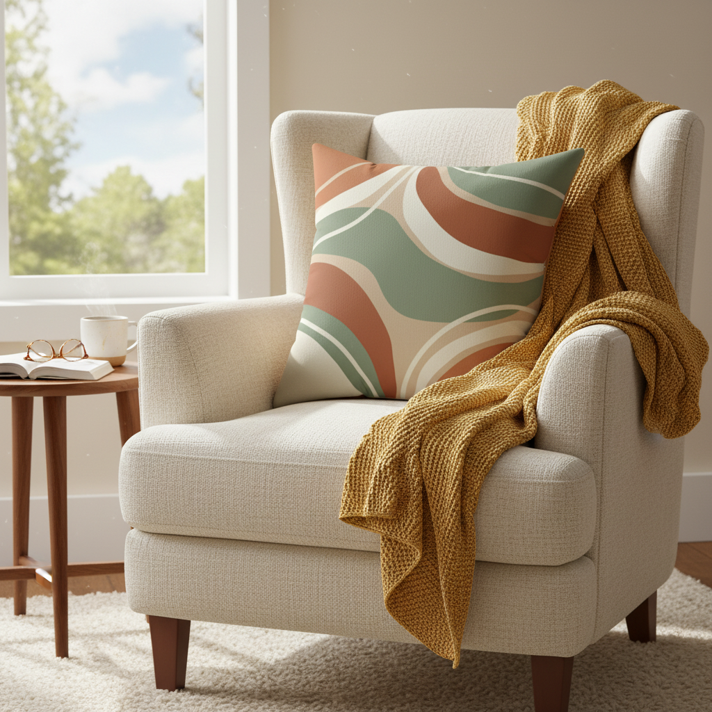 Abstract Retro Wave Throw Pillow — Earth Tones Decorative Cushion for Living Room. This stylish and unique throw pillow adds a touch of retro charm to any living room decor. It is perfect for those who appreciate earth tones and a vintage aesthetic, making it a great addition for cozy nights in or gatherings with friends. Ideal for those who love to decorate their homes for holidays or special occasions.